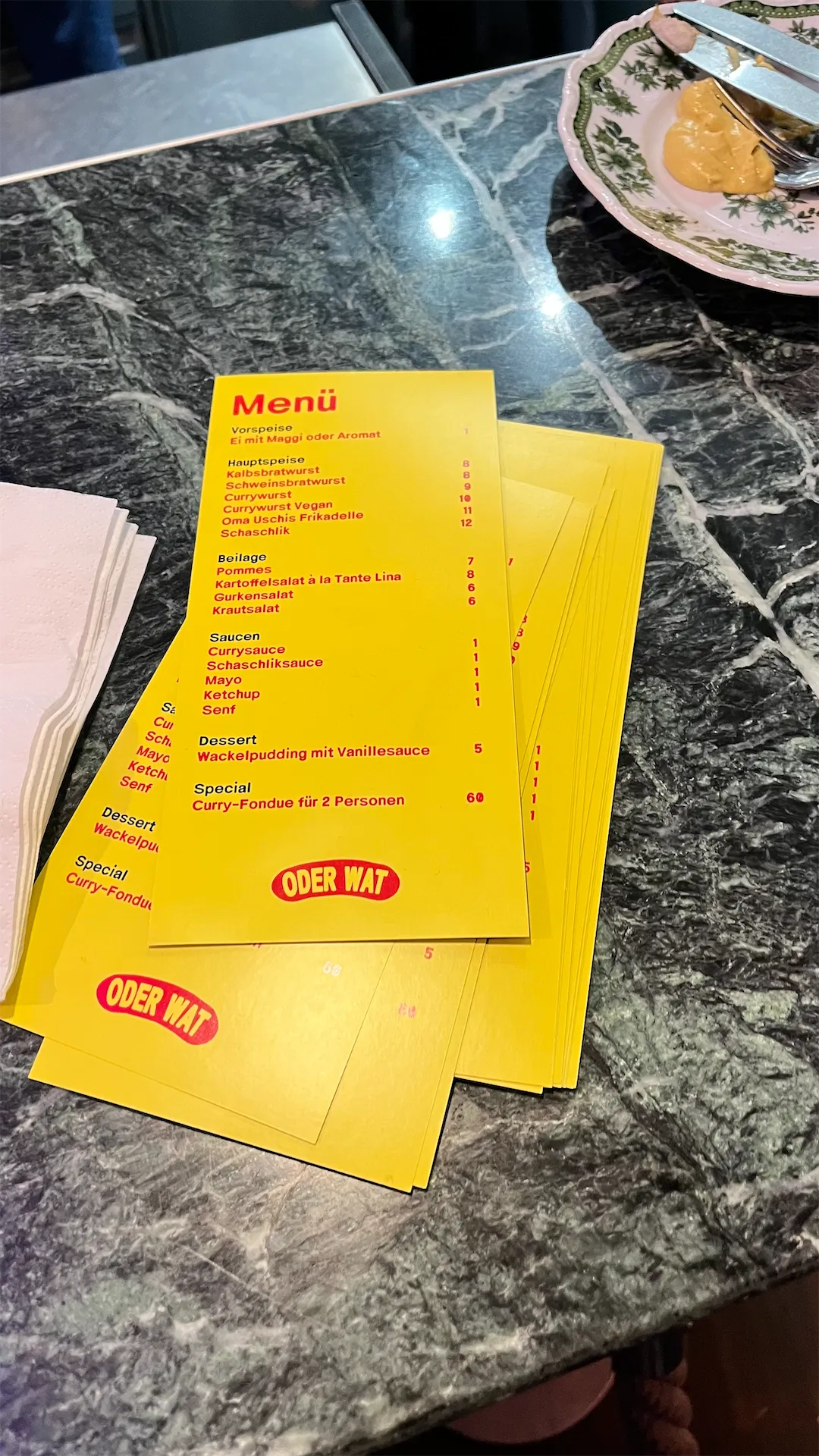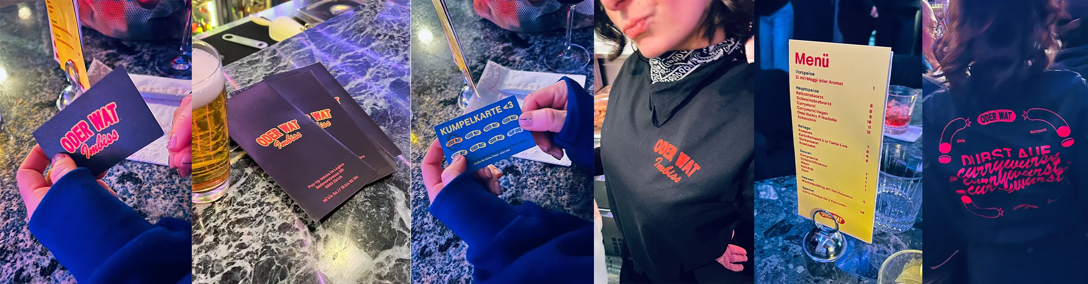 - Seit Januar 26 gibts den Oder Watt Imbiss mit der besten Currywurst der Stadt und dem leckersten Kartoffelsalat überhaupt. Zusammen mit Francesca Schenker habe ich Logo, Brand Identity und Merch gestaltet.