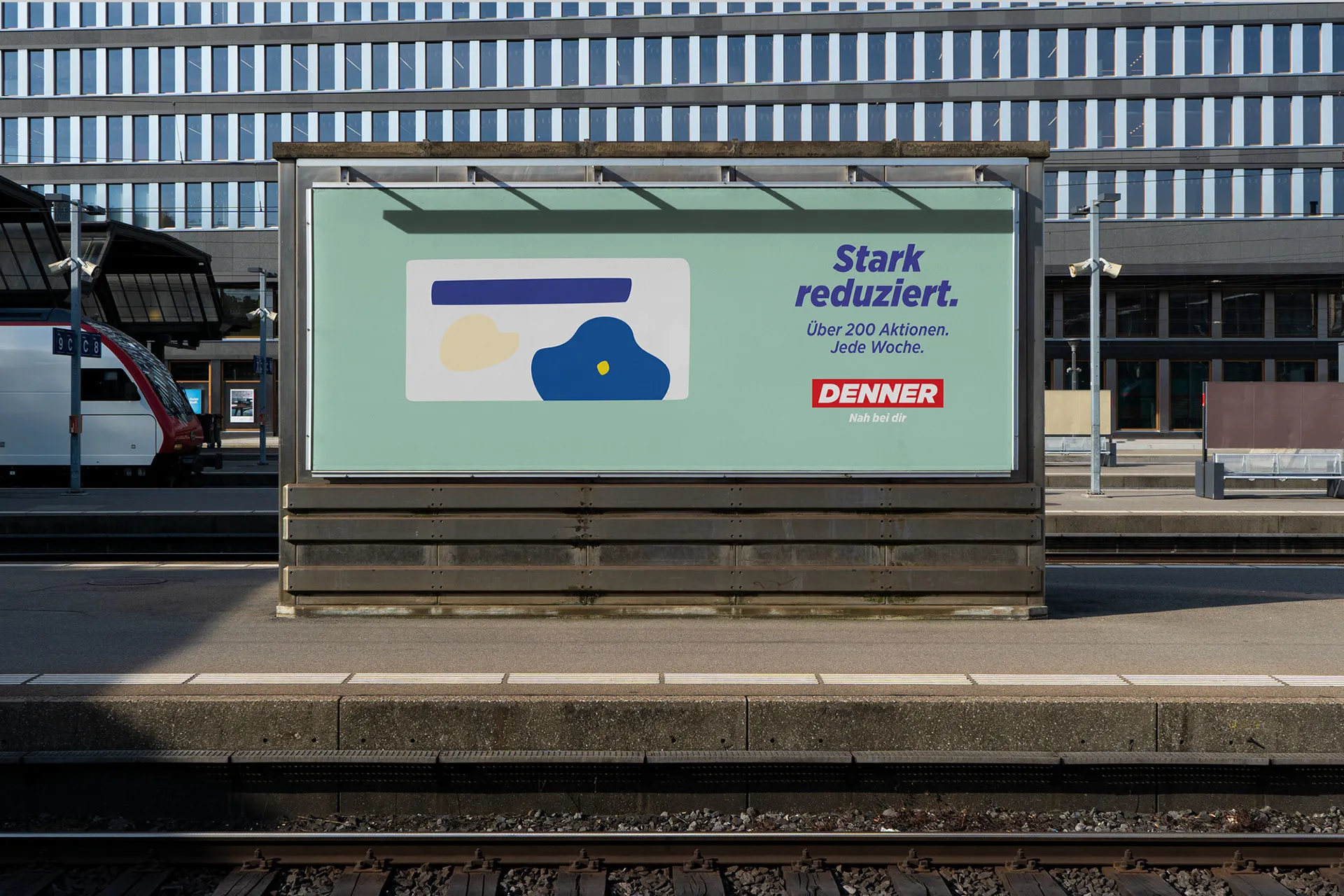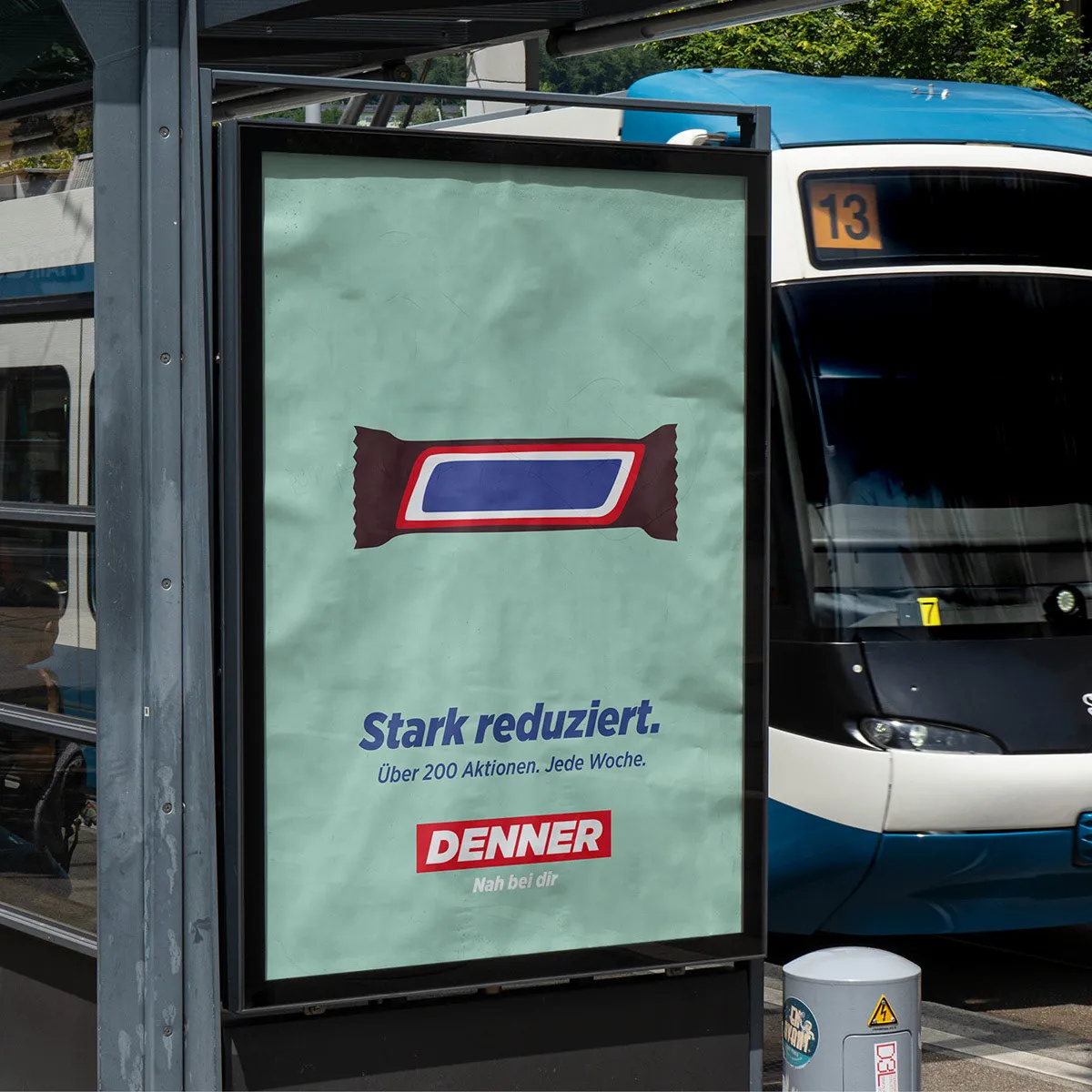 Denner wollte bewerben, dass sie sehr viele reduzierte Markenartikel im Angebot haben. Dafür haben wir ihnen eine einprägsame OOH Kampagne kreiert.