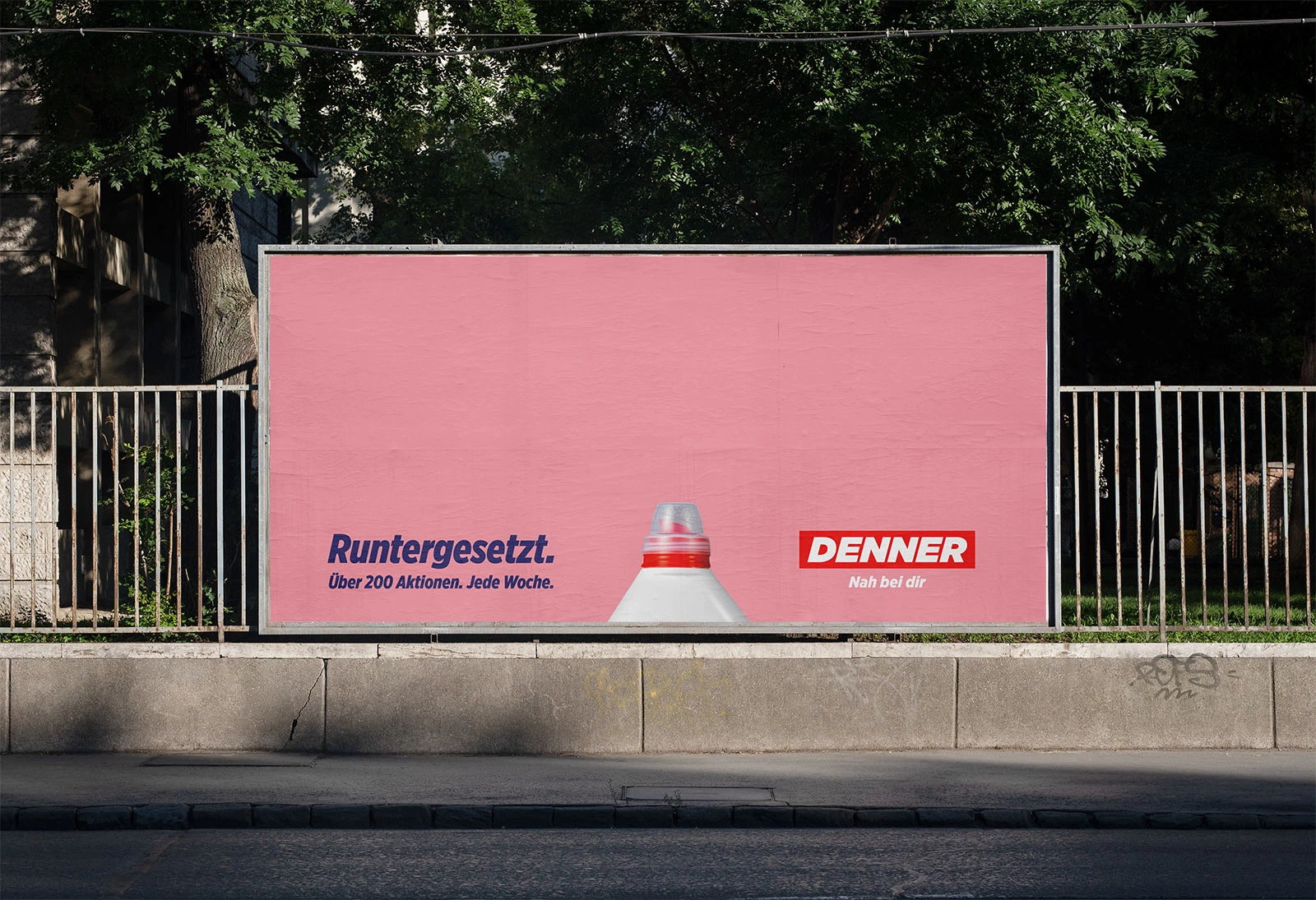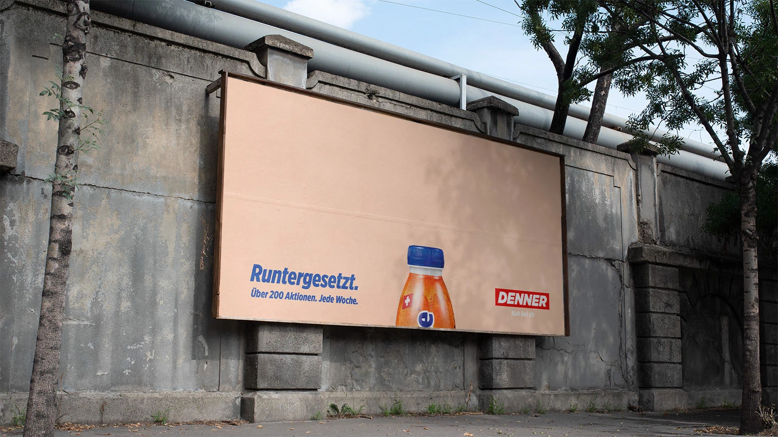 Denner bietet dauerhaft viele heruntergesetzte Markenartikel. Das übersetzten wir wortwörtlich in eine OOH-Kampagne – und setzten die Marken auf dem Plakat einfach tiefer.